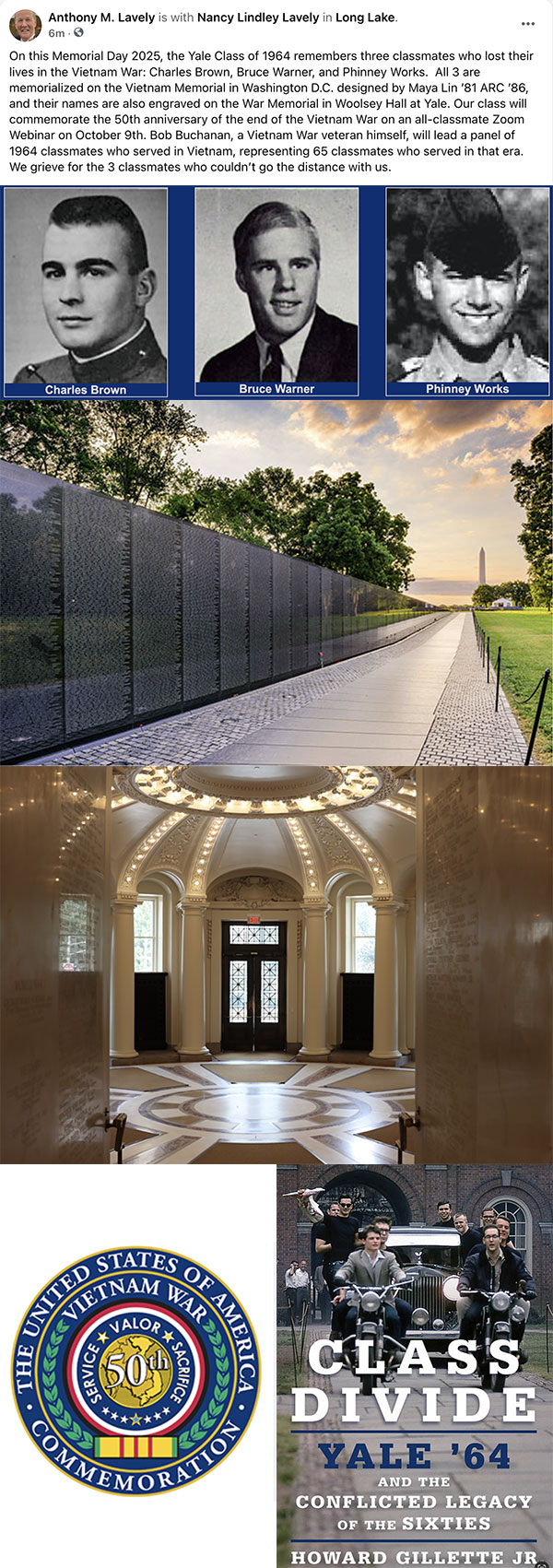 Tony Lavely’64, our Class Secretary, posted this remembrance of our Vietnam War classmates on Facebook and shared it with other Yale alumni.